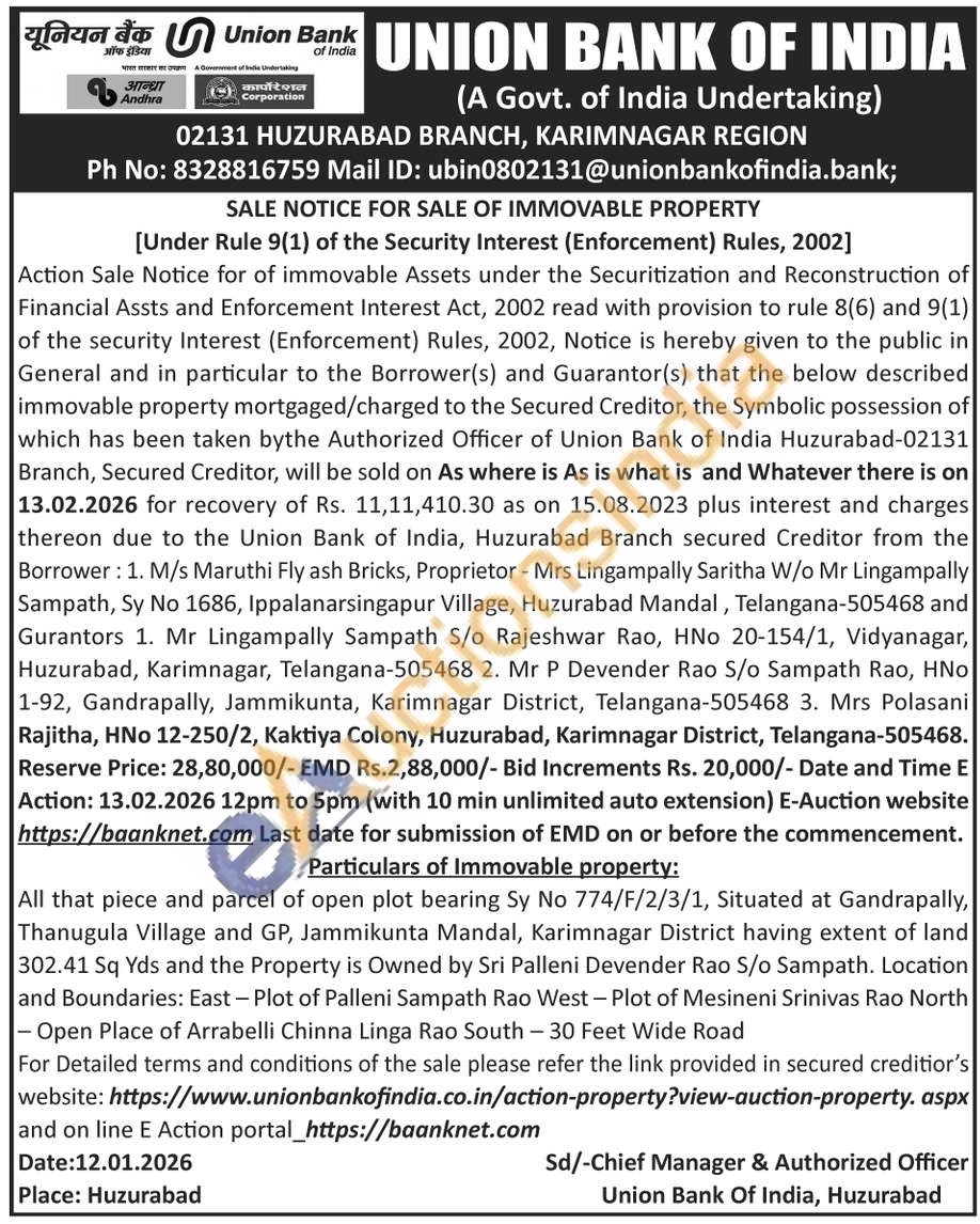 All that piece and parcel of open plot bearing Sy No 774/F/2/3/1, Situated at Gandrapally, Thanugula Village and GP, Jammikunta Mandal, Karimnagar District having extent of land 302.41 Sq Yds and the Property is Owned by Sri Palleni Devender Rao S/o Sampath. Location and Boundaries: East - Plot of Palleni Sampath Rao West - Plot of Mesineni Srinivas Rao North - Open Place of Arrabelli Chinna Linga Rao South - 30 Feet Wide Road