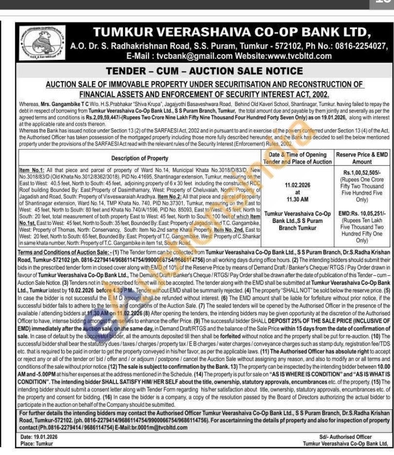 Item No.1: All that piece and parcel of property of Ward No.14, Municipal Khata No.3018/D/83/D, New No.3018/83/D (Old Khata No. 3012/8362/3018), PID No.41695, Shantinagar extension, Tumkur, measuring on the East to West: 40.5 feet, North to South: 45 feet, adjoining property of 6 x 30 feet including the constructed RCC Roof building Bounded By: East:Property of Dasimthamary, West: Property of Cheluvaiah, North: Property of Jagadish and Road, South: Property of Visveswaraiah Aradhya. Item No.2: All that piece and parcel of property of Shantinagar extension, Ward No. 14, TMP Khata No. 740, PID No.37301, Tumkur, measuring on the East to West: 45 feet, North to South: 80 feet and Khata No.740/A/1596, PID No. 85093, East to West: 45 feet, North to South: 20 feet, total measurement of both property East to West: 45 feet, North to South: 100 feet of which Item No.1st, East to West: 45 feet, North to South: 35 feet, Bounded By: East: Property of Jagadish and T.C. Gangambike. West: Property of Thomas, North: Conservancy, South: Item No.2nd same Khata Property. Item No. 2nd, East to West: 20 feet, North to South: 65 feet, Bounded By: East: Property of T.C. Gangambike, West: Property of C.Shankar in same khata number, North: Property of T.C. Gangambike in item 1st, South: Road.
