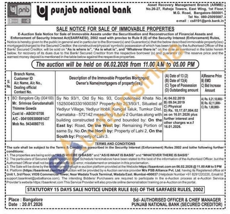 Sy No 93/1, Old Sy No. 93, Computerised Khata No. 152500403301600357 Property No 253/93/1, Situated at Yediyur Village, Yediyur Hobli, Kunigal Taluk, Tumkur Dist. Karnataka-572142 measuring 1 Acre 2 Guntas along with building constructed there on and bounded by: On the East by: Road, On the West by: Remaining Portion of same Sy. No.On the North by: Property of Lahi 2, On the South by: Property of Lahi 3.