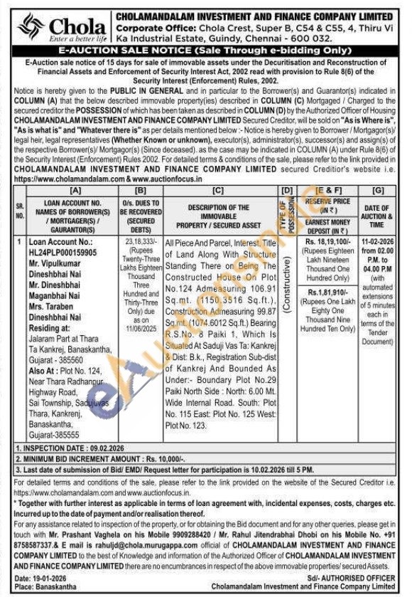 All Piece And Parcel, Interest, Title of Land Along With Structure Standing There on Being The Constructed House On Plot No.124 Admeasuring 106.91 Sq.mt. (1150.3516 Sq.ft.). Construction Admeasuring 99.87 Sq.mt. (1074.6012 Sq.ft.) Bearing R.S.No. 8 Paiki 1, Which Is Situated At Saduji Vas Ta: Kankrej & Dist: B.k., Registration Sub-dist of Kankrej And Bounded As Under: Boundary Plot No.29 Paiki North Side: North: 6.00 ML. Wide Internal Road. South: Plot No. 115 East Plot No. 125 West Plot No. 123.