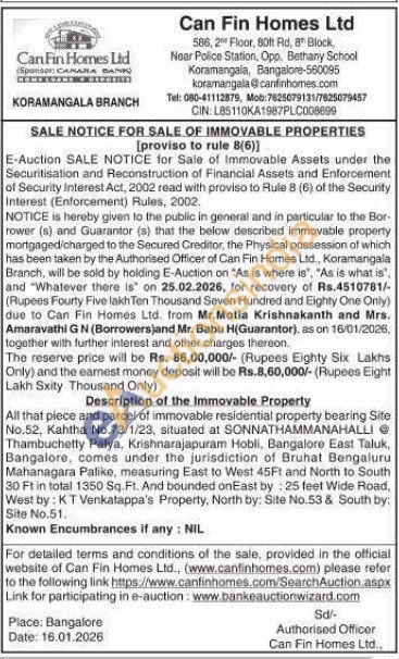 Description of the Immovable Property: All that piece and parcel of immovable residential property bearing Site No.52, Kahtha No.73/1/23, situated at SONNATHAMMANAHALLI Thambuchetty Palya, Krishnarajapuram Hobli, Bangalore East Taluk, Bangalore, comes under the jurisdiction of Bruhat Bengaluru Mahanagara Palike, measuring East to West 45Ft and North to South 30 Ft in total 1350 Sq. Ft. And bounded onEast by: 25 feet Wide Road, West by: KT Venkatappa's Property, North by: Site No.53 & South by: Site No.51