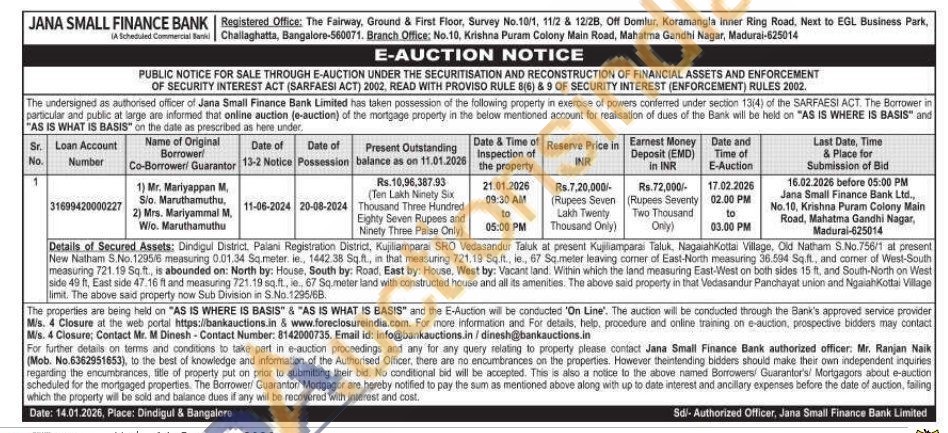 Dindigul District, Palani Registration District, Kujiliamparai SRO Vedasandur Taluk at present Kujiliamparai Taluk, NagaiahKotta Village, Old Natham S.No.756/1 at present New Natham S.No. 1295/6 measuring 0.01,34 Sq.meter. ie, 1442.38 Sq.ft, in that measuring 721,19 Sq.ft, ie, 67 Sq.meter leaving comer of East-North measuring 36.594 Sq.ft., and corner of West-South measuring 721.19 Sq.ft., is abounded on: North by: House, South by: Road, East by: House, West by: Vacant land. Within which the land measuring East-West on both sides 15 ft, and South-North on West side 49 ft, East side 47.16 ft and measuring 721.19 sq.ft., ie, 67 Sq.meter land with constructed house and all its amenities. The above said property in that Vedasandur Panchayat union and Ngaiah Kottai Village limit. The above said property now Sub Division in S.No. 1295/68