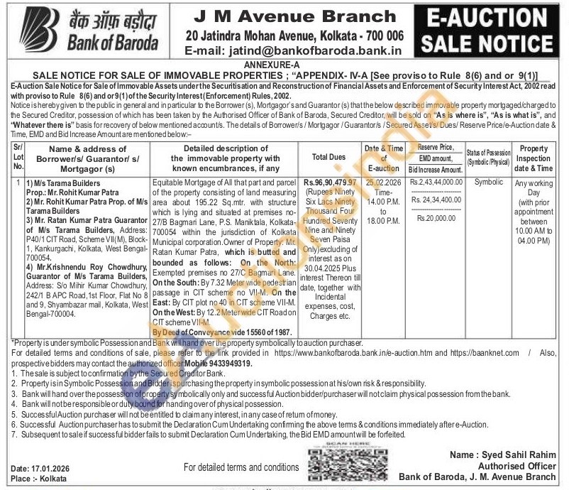 Equitable Mortgage of All that part and parcel of the property consisting of land measuring area about 195.22 Sq.mtr. with structure which is lying and situated at premises no-27/B Bagmari Lane, P.S. Maniktala, Kolkata-700054 within the jurisdiction of Kolkata Municipal corporation. Owner of Property: Mr. Ratan Kumar Patra, which is butted and bounded as follows: On the North: Exempted premises no 27/C Bagmari Lane. On the South: By 7.32 Meter wide pedestrian passage in CIT scheme no VII-M. On the East: By CIT plot no 40 in CIT scheme VII-M. On the West: By 12.2 Meter wide CIT Roadon CIT scheme VII-M.