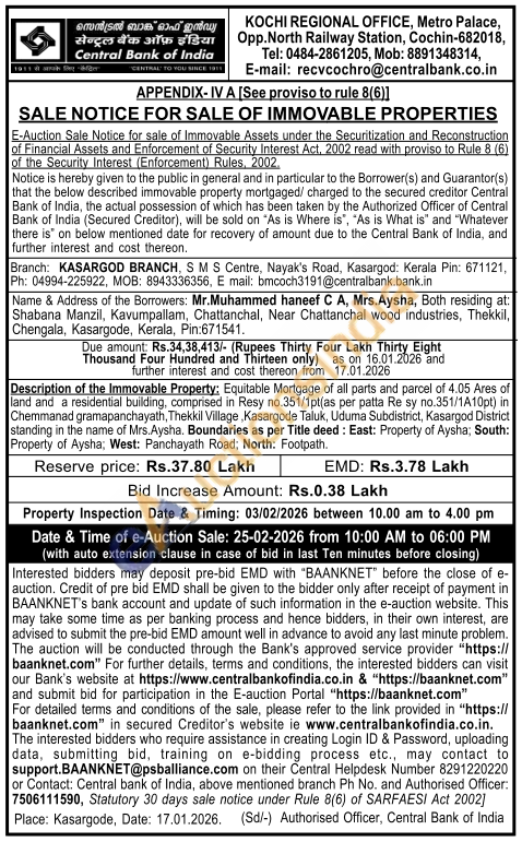 Description of the Immovable Property: Equitable Mortgage of all parts and parcel of 4.05 Ares of land and a residential building, comprised in Resy no.351/1pt(as per patta Re sy no.351/1A10pt) in Chemmanad gramapanchayath, Thekkil Village, Kasargode Taluk, Uduma Subdistrict, Kasargod District standing in the name of Mrs. Aysha. Boundaries as per Title deed: East: Property of Aysha, South: Property of Aysha; West: Panchayath Road; North: Footpath