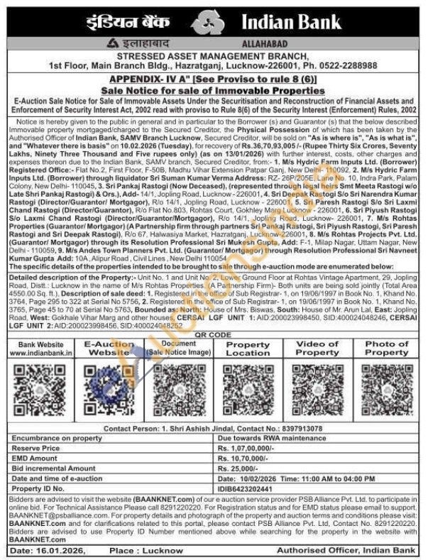 Detailed description of the Property:- Unit No. 1 and Unit No. 2, Lower Ground Floor at Rohtas Vintage Apartment, 29, Jopling Road, Distt: Lucknow in the name of Mis Rohtas Properties, (A Partnership Firm)- Both units are being sold jointly (Total Area 4550.00 Sq. ft.), Description of sale deed: 1. Registered in the office of Sub Registrar-1, on 19/06/1997 in Book No. 1, Khand No. 3764, Page 295 to 322 at Serial No 5756, 2. Registered in the office of Sub Registrar- 1, on 19/06/1997 in Book No. 1, Khand No. 3765, Page 45 to 70 at Serial No 5763, Bounded as: North: House of Mrs. Biswas, South: House of Mr. Arun Lal, East: Jopling Road, West: Gokhale Vihar Marg and other houses