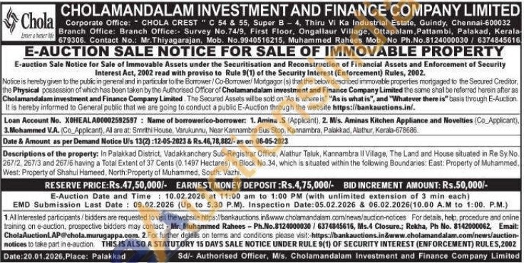 Descriptions of the property: In Palakkad District, Vadakkanchery Sub-Registrar Office, Alathur Taluk, Kannambra II Village, The Land and House situated in Re Sy.No. 267/2, 267/3 and 267/6 having a Total Extent of 37 Cents (0.1497 Hectares) in Block No. 34, which is situated within the following Boundaries: East: Property of Muhammed. West: Property of Shahul Hameed, North: Property of Muhammed, South: Vazhi
