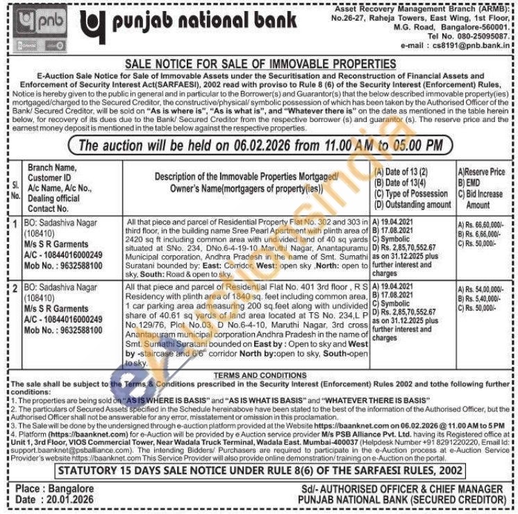 All that piece and parcel of Residential Property Fiat No. 302 and 303 in third floor, in the building name Sree Pearl Apartment with plinth area of 2420 sq ft including common area with undivided land of 40 sq yards situated at SNo. 234, DNo.6-4-19-10 Maruthi Nagar, Anantapuramu Municipal corporation, Andhra Pradesh in the name of Smt. Sumathi Suratani bounded by: East: Corridor, West: open sky North: open to sky, South: Road & open to sky.
