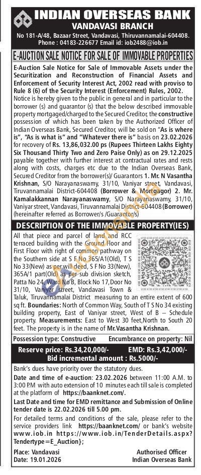 All that piece and parcel of land and RCC terraced building with the Ground Floor and First Floor with right of common pathway on the Southern side at S F No 365/A1(Old), TS No 33 (New) as per will deed, SF No 33(New), 365A/1 part(Old) as per sub division sketch, Patta No 24, Ward No B, Block No 17, Door No 31/10, Vaniyar street, Vandavasi Town & Taluk, Tiruvannamalai District measuring to an entire extent of 600 sq ft. Boundaries: North of Common Way, South of T S No 34 existing building property, East of Vaniyar street, West of B Schedule property. Measurements: East to West 30 feet, North to South 20 feet. The property is in the name of Mr. Vasantha Krishnan