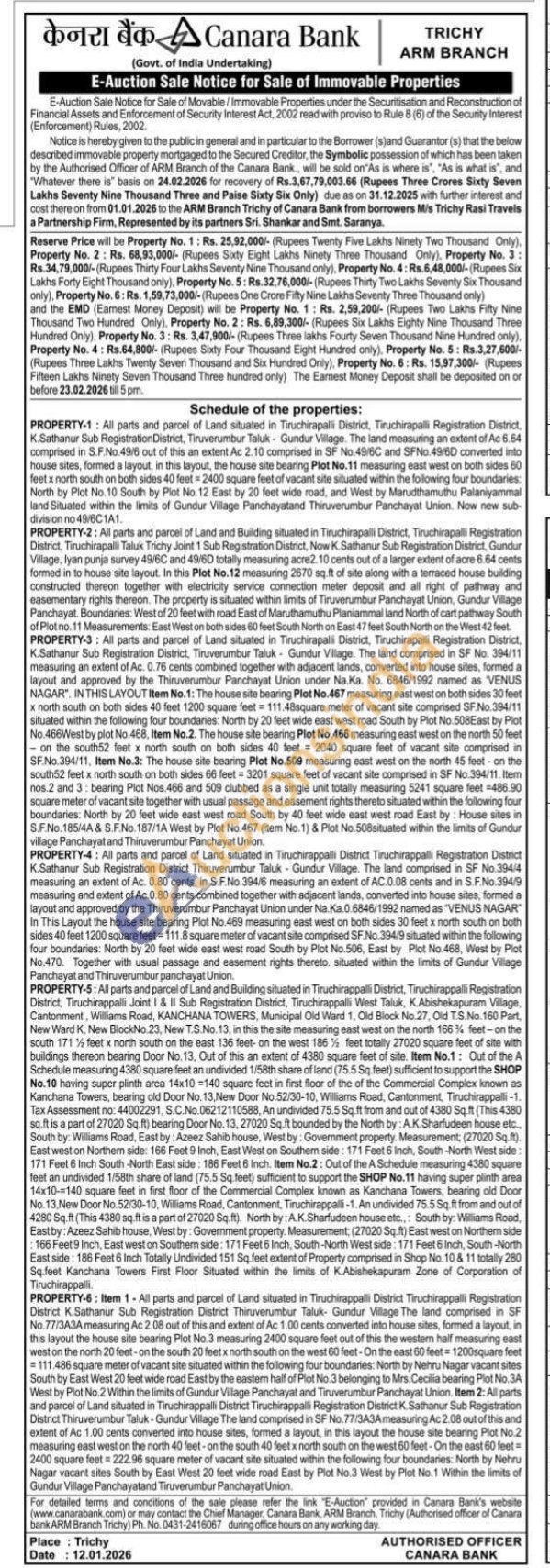 PROPERTY-1: All parts and parcel of Land situated in Tiruchirapalli District, Tiruchirapalli Registration District, K.Sathanur Sub Registration District, Tiruverumbur Taluk Gundur Village. The land measuring an extent of Ac 6.64 comprised in S.F.No.49/6 out of this an extent Ac 2.10 comprised in SF No.49/6C and SFNo.49/60 converted into house sites, formed a layout, in this layout, the house site bearing Plot No.11 measuring east west on both sides 60 feet x north south on both sides 40 feet 2400 square feet of vacant site situated within the following four boundaries: North by Plot No. 10 South by Plot No. 12 East by 20 feet wide road, and West by Marudthamuthu Palaniyammal land Situated within the limits of Gundur Village Panchayatand Thiruverumbur Panchayat Union. Now new sub-division no 49/6C1A1.