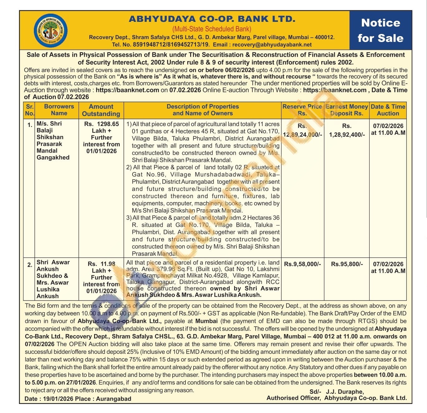 1) All that piece of parcel of agricultural land totally 11 acres 01 gunthas or 4 Hecteres 45 R, situated at Gat No.170, Village Bilda, Taluka Phulambri, District Aurangabad together with all present and future structure/building constructed/to be constructed thereon owned by M/s. Shri Balaji Shikshan Prasarak Mandal. 2) All that Piece & parcel of land totally 02 R, situated at Gat No.96, Village Murshadabadwadi, Taluka-Phulambri, District Aurangabad together with all present and future structure/building constructed/to be constructed thereon and furniture, fixtures, lab equipments, computer, machinery, books, etc owned by M/s Shri Balaji Shikshan Prasarak Mandal. 3) All that Piece & parcel of land totally adm.2 Hectares 36 R. situated at Gat No.170, Village Bilda, Taluka Phulambri, Dist. Aurangabad together with all present and future structure/building constructed/to be constructed thereon owned by M/s. Shri Balaji Shikshan Prasarak Mandal.