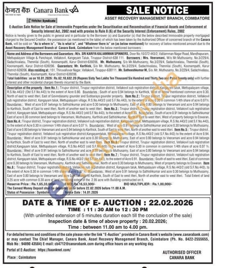 Description of the property: Item No.1: Tirupur district, Tirupur registration district, Vellakovil sub registration district, Kangayam taluk, Mettupalayam village, R.S.No.443/2 (Old S.F.No.443) to the extent of Acre 0.80. Boundaries: South of acre 0.94 belongs to Karthick, West of below mentioned common acre 0.30, North of east to west itteri, East of Govindasamy gounder and Subbaraya gounder property. Item No.2: Tirupur district, Tirupur registration district, Vellakovil sub registration district, Kangayam taluk, Mettupalayam village, R.S.No.443/2 (old S.F.No.443), to the extent of Acre 0.30 in common 1/4th share of acre 0.07%. Boundaries: West of acre 0.91 belongs to Sathishkumar and acre 0.30 belongs to Muthusamy, East of acre 0.80 belongs to Veeramani and acre 0.94 belongs to Karthick, South of East to west itteri, North of another east to west itteri. Item No.3: Tirupur district, Tirupur registration district, Vellakovil sub registration district, Kangayam taluk, Mettupalayam village, R.S.No. 443/2 (old S.F.No.443), to the extent of Acre 0.30. Boundaries: South of acre 0.91 belongs to Sathishkumar East of acre 0.30 common land belongs to Veeramani, Muthusamy, Karthick and Sathishkumar, North of East to west itteri, West of property belongs to Eswaran. Item No.4: Tirupur district, Tirupur registration district, Vellakovil sub registration district, Kangayam taluk, Mettupalayan village, R.S.No.443/2 (old S.F.No.443), to the extent of Acre 0.30 in common 1/4th share of acre 0.07 14. Boundaries: West of acre 0.91 belongs to Sathishkumar and acre 0.30 belongs to Muthusamy, East of acre 0.80 belongs to Veeramani and acre 0.94 belongs to Karthick, South of East to west itteri, North of another east to west itteri. Item No.5: Tirupur district, Tirupur registration district, Vellakovil sub registration district, Kangayamtaluk, Mettupalayam village, R.S.No.443/2 (old S.F.No.443) to the extent of Acre 0.94. Boundaries: West of acre 0.91 belongs to Sathishkumar and acre 0.30 belongs to Muthusamy. East of acre 0.80 belongs to Veeramani and acre 0.94 belongs to Karthick, South of East to west itteri, North of another east to west itteri. Item No.6: Tirupur district, Tirupur registration district. Vellakovil sub registration district, Kangayam taluk, Mettupalayam village, R.S.No.443/2 (old S.F.No.443) to the extent of Acre 0.30 in common in common 1/4th share of acre 0.07%. Boundaries: West of acre 0.91 belongs to Sathishkumar and acre 0.30 belongs to Muthusamy. East of acre 0.80 belongs to Veeramani and acre 0.94 belongs to Karthick, South of East to west itteri, North of another east to west itteri. Item No.7: Tirupur district, Tirupur registration district, Vellakovil sub registration district, Kangayam taluk, Mettupalayam village, R.S.No.443/2 (old S.F.No.443), to the extent of Acre 0.91. Boundaries: South of east to west itteri, East of common acre 0.30 belongs to Veeramani, Muthusamy, Karthick and Sathishkumar, North of acre 0.30 belongs to Muthusamy, West of property belongs to Eswaran. Item No.8: Tirupur district. Tirupur registration district, Vellakovil sub registration district, Kangayam taluk, Mettupalayam village, R.S.No.443/2 (old S.F.No.443), to the extent of Acre 0.30 in common 1/4th share of acre 0.07 14. Boundaries: West of acre 0.91 belongs to Sathishkumar and acre 0.30 belongs to Muthusamy, East of acre 0.80 belongs to Veeramani and acre 0.94 belongs to Karthick, South of East to west itteri, North of another east to west itteri. Total Extent of land 3.25 acre with common 0.30 acre of land remaining extent of the 2.95 acre with Building constructed on it.