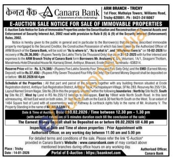 Schedule of the Properties: All that part and parcel of the property together with any building thereon situated at Erode Registration district, Anthiyur Sub Registration District, Anthiyur Taluk, Pachapalayam Village, SF No.283. Resurvey No.255/13A, Layout Named Sriram Nagar, Site No.28 In this the property situated within the following boundaries: North by Site No29, South by Site No.27, West by Land in RS No.255/12 belongs to Veerappan, East by 16feet wide North South Road. In this land admeasuring, 48 feet East west on both sides, 31 feet North South on the East & 30 feet North South on the West. To an extant of 1464 Square feet of Land with all easementary way of Pathway & carttrack rights fully in the name of Mr. Arulsarmy V. The Property Standing in the name of Mr. ARULSAMY V.