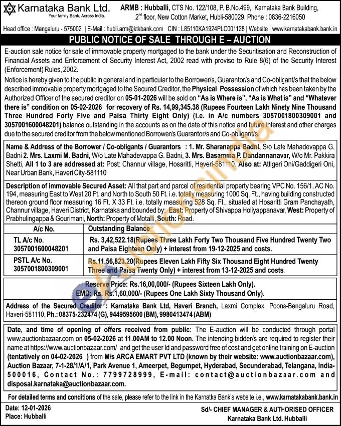 Description of immovable Secured Asset: All that part and parcel of residential property bearing VPC No. 156/1, AC No. 194, measuring East to West 20 Ft. and North to South 50 Ft. i.e. totally measuring 1000 Sq. Ft., having building constructed thereon ground floor measuring 16 Ft. X 33 Ft. i.e. totally measuring 528 Sq. Ft., situated at Hosaritti Gram Panchayath, Channur village, Haveri District, Karnataka and bounded by: East: Property of Shivappa Holiyappanavar, West: Property of Prabhulingappa & Gourimani, North: Property of Motalli, South: Road.