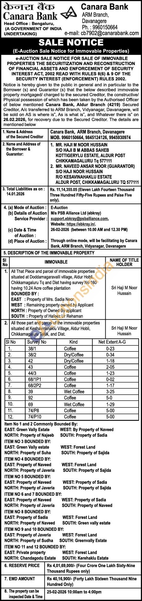 All That Piece and parcel of immovable properties situated at Doddamagaravalli village, Aldur Hobli, Chikkamagaluru Tq and Dist having survey No 160 having 10.24 Acre coffee plantation