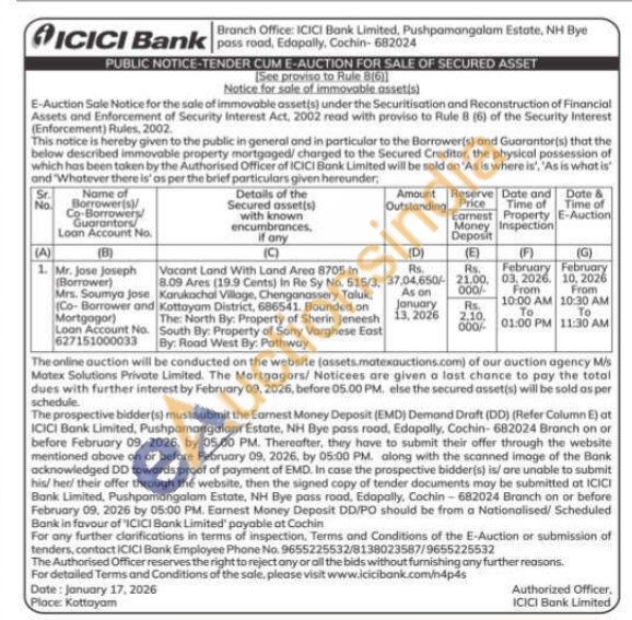 Vacant Land With Land Area 8705 In 8.09 Ares (19.9 Cents) in Re Sy No. 515/3, Karukachal Village, Chenganassery Taluk.Kottayam District, 686541. Bounded on The North By: Property of Sherin Jeneesh South By: Property of Sony Varghese East By: Road West By: Pathway