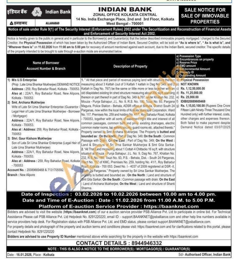 All that piece and parcel of revenue paying land with structure thereon measuring about 3 Kattah (out of 3 Kattah 1 kattah in Dag No. 349, and 2 . Kattah in Dag No. 767) be the same or little more or less together with an old dilapidated existing tin shed structure measuring about 200 sq.ft. standing thereon or part thereof in part of Dag No. 349 & 767, under Khatian No. 232. Mouza-Punja Sahapur, J.L. No. 9. R.S. No. 180, Touzi No. 93, Pargana Magura, Police Station - Behala, ADSR office at Behala, District South 24 g) Parganas, now within the local limits of Kolkata Municipal Corporation, Ward No. 117, Premises No. 259 and holding No. 41/1, Roy Bahadur Road, Kolkata 700053, together with all sorts of easement right title and interest of all common passages, common bath and privy, existing drainages, electric common meter rooms, lap waters security guard rooms etc. attached thereto." Property owned by Smt Archana Mukherjee. The Property is butted and bounded as: On the North: Part of Dag No. 349. On the South: Common Passage with Drain, On the East: Part of Dag No. 349, On the West: Land & Structure of Sri Uma Sankar Mukherjee & Smt Gita Sarkar. 2. "All That Land measuring about 1 Cottah 4 Chittacks 16 sq.ft. with structure situated at Mouza - Punja Sahapur. J.L. No. 9, Dag No. 767, Khatian No. 232, R.S. No. 180, Touzi No. 93, P.S. Behala, Dist. South 24 Parganas, Ward No. 117 of KMC, Premises No. 259, holding No. 41/1, Roy Bahadur Road, Kolkata-700 053. Deed No. 1-4037 of 2009 registered at DSR-II. South 24 Parganas" Property owned by Sri Uma Sankar Mukherjee. The property is butted and bounded as: On the North: Land and structure of Smt Gita Sarkar, On the South: Common passage with drain, On the East Land of Archana Mukherjee, On the West: Land and structure of Shanti Sharma