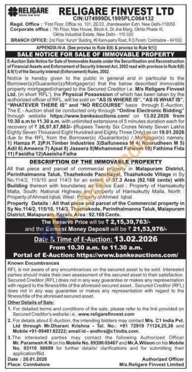 All that piece and parcel of commercial property in Malapuram District, Perinthalmanna Taluk, Thazhekode Panchayat, Thazhekode Village in Sy No. 114/2, 115/10 and 114/3 for an extent of 37.3 Ares (92.168 cents) with Building thereon with boundaries as follows East: Property of Hamsakutty Malla, South: National Highway and property of Hamsakutty Malla, North Property of Ahmed Iqbal, West: Property of Ahmed Iqbal.