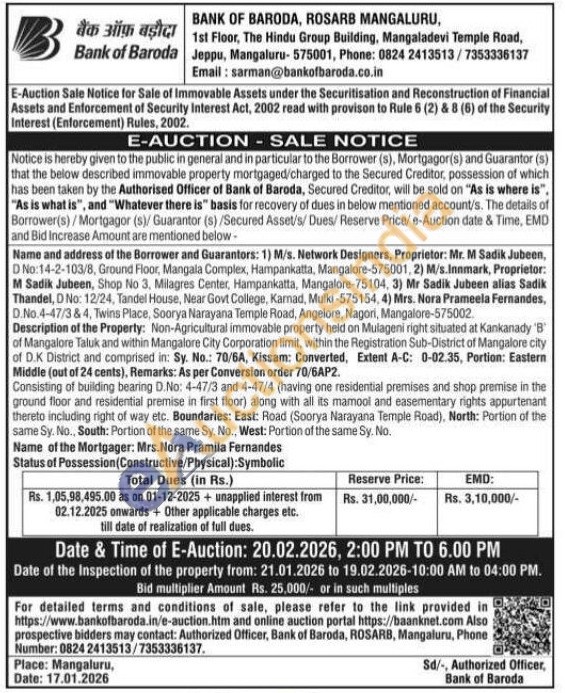 contact: Authorized Officer, Bank of Baroda, ROSARB, Mangaluru, Phone Number: 0824 2413513/7353336137