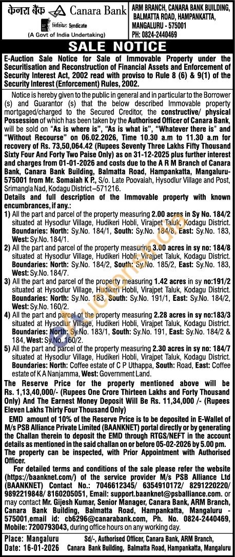 All the part and parcel of the property measuring 2.00 acres in Sy No. 184/2 situated at Hysodlur Village, Hudikeri Hobli, Virajpet Taluk, Kodagu District. Boundaries: North: Sy.No. 184/1, South: Sy.No. 184/8, East: Sy.No. 183, West: Sy.No. 184/1. 2) All the part and parcel of the property measuring 3.00 acres in sy no: 184/8 situated at Hysodlur Village, Hudikeri Hobli, Virajpet Taluk, Kodagu District. Boundaries: North: Sy.No. 184/2, South: Sy.No. 185/2, East: Sy.No. 183, West: Sy.No. 184/7. 3) All the part and parcel of the property measuring 1.42 acres in sy no:191/2 situated at Hysodlur Village, Hudikeri Hobli, Virajpet Taluk, Kodagu District. Boundaries: North: Sy. No. 183, South: Sy.No. 191/1, East: Sy.No. 184/2, West: Sy.No. 160/2. 4) All the part and parcel of the property measuring 2.28 acres in sy no:183/3 situated at Hysodlur Village, Hudikeri Hobli, Virajpet Taluk, Kodagu District. Boundaries: North: Sy.No. 183/1, South: Sy.No. 191, East: Sy.No. 184/2 & 184, West: Sy. No. 160/2. 5) All the part and parcel of the property measuring 2.30 acres in sy no: 184/7 situated at Hysodlur Village, Hudikeri Hobli, Virajpet Taluk, Kodagu District. Boundaries: North: Coffee estate of C P Uthappa, South: Road, East: Coffee estate of K A Nanjamma, West: Government Land.