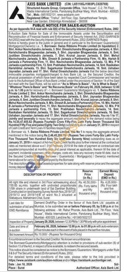 All right title and interest in 3rd Floor admeasuring about 155.85 sq.mtrs. together with undivided proportionate 1/5th share in underneath land of Sai Darshan Buliding, Constructed on on land land b bearing Survey Nondh Nos.2919/12 2919/13 and 2919/14/B of ward No.3 situated at Slabatpura, Mahatmani Chal, Surat