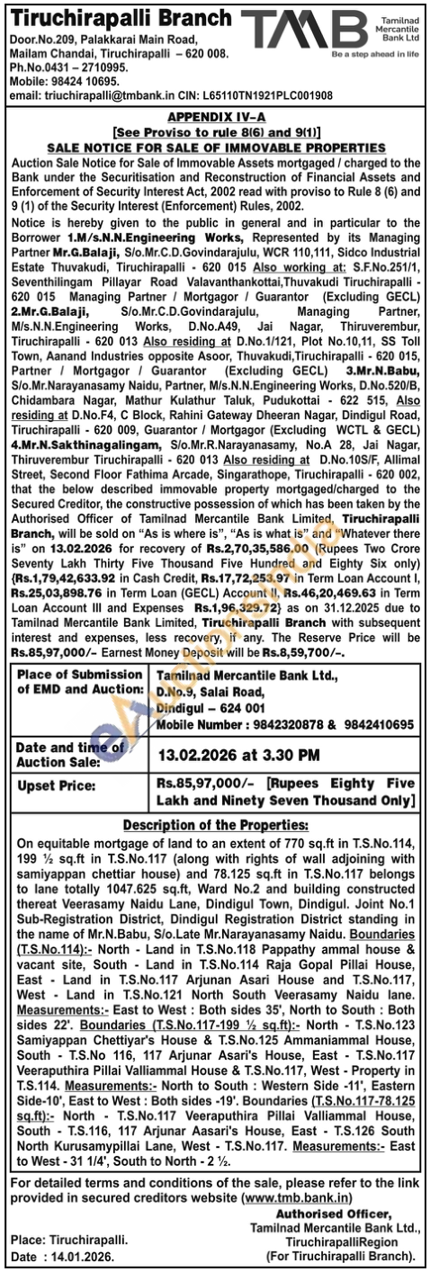On equitable mortgage of land to an extent of 770 sq.ft in T.S.No. 114, 199 sq.ft in T.S.No.117 (along with rights of wall adjoining with samiyappan chettiar house) and 78.125 sq.ft in T.S.No.117 belongs. to lane totally 1047.625 sq.ft, Ward No.2 and building constructed. thereat Veerasamy Naidu Lane, Dindigul Town, Dindigul. Joint No.1 Sub-Registration District, Dindigul Registration District standing in the name of Mr.N.Babu, S/o.Late Mr.Narayanasamy Naidu. Boundaries (T.S.No.114): North Land in T.S.No.118 Pappathy ammal house & vacant site, South Land in T.S.No.114 Raja Gopal Pillai House, East Land in T.S.No.117 Arjunan Asari House and T.S.No.117, West Land in T.S.No.121 North South Veerasamy Naidu lane. Measurements:- East to West: Both sides 35', North to South: Both sides 22'. Boundaries (T.S.No.117-199 ½ sq.ft): North T.S.No.123 Samiyappan Chettiyar's House & T.S.No.125 Ammaniammal House, South T.S.No 116, 117 Arjunar Asari's House, East T.S.No.117 Veeraputhira Pillai Valliammal House & T.S.No. 117, West Property in T.S.114. Measurements: North to South Western Side -11, Eastern Side-10', East to West: Both sides -19'. Boundaries (T.S.No. 117-78.125 sq.ft): North T.S.No.117 Veeraputhira Pillai Valliammal House, South T.S.116, 117 Arjunar Aasari's House, East T.S.126 South North Kurusamypillai Lane, West T.S.No.117. Measurements:- East to West-31 1/4', South to North-2%.