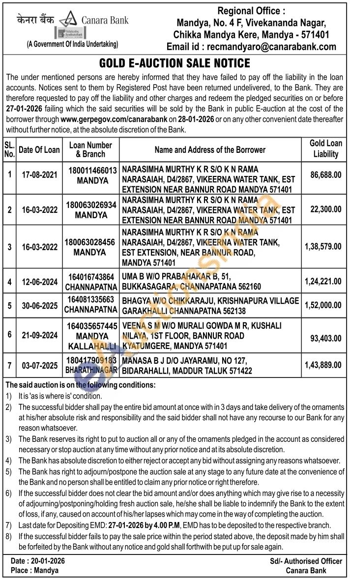 Canara Bank Gold Auctions Auction in Mandya