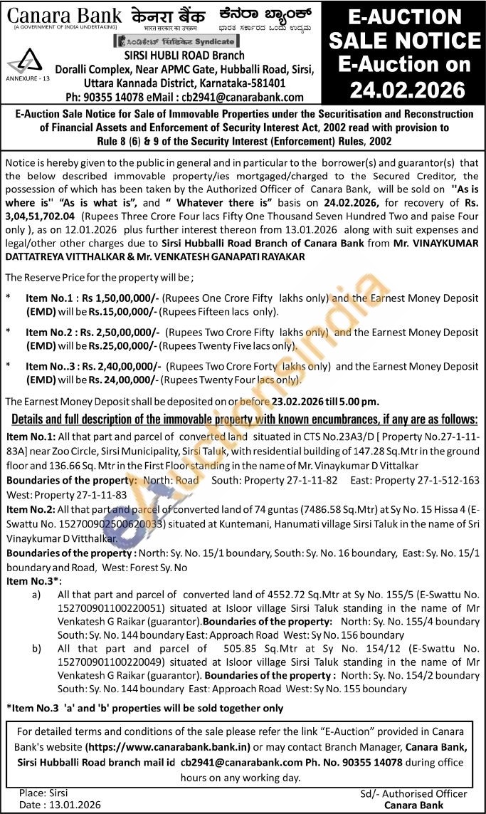All that part and parcel of converted land situated in CTS No.23A3/D | Property No.27-1-11-83A] near Zoo Circle, Sirsi Municipality, Sirsi Taluk, with residential building of 147.28 Sq.Mtr in the ground floor and 136.66 Sq. Mtr in the First Floor standing in the name of Mr. Vinaykumar D Vittalkar Boundaries of the property: North: Road South: Property 27-1-11-82 East: Property 27-1-512-163 West: Property 27-1-11-83