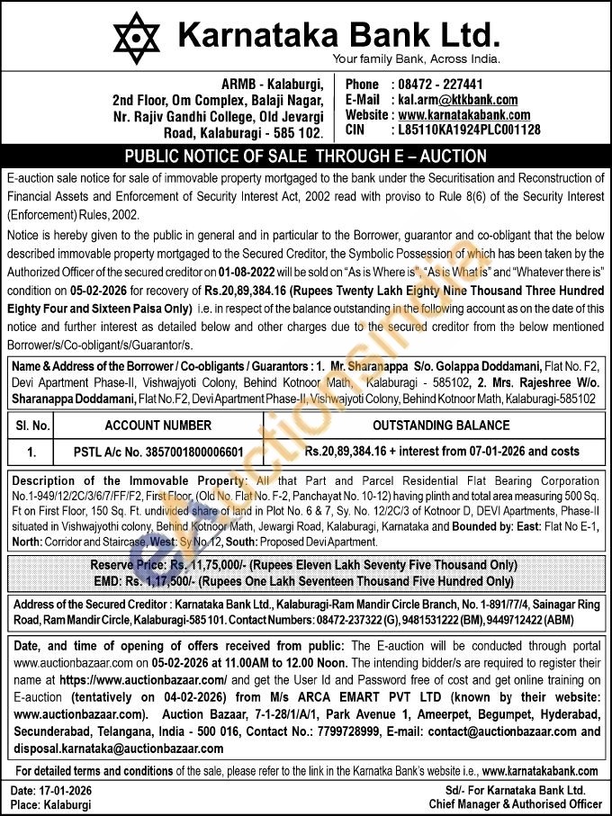 Description of the Immovable Property: All that Part and Parcel Residential Flat Bearing Corporation No.1-949/12/20/3/6/7/FF/F2, First Floor, (Old No. Flat No. F-2, Panchayat No. 10-12) having plinth and total area measuring 500 Sq. Ft on First Floor, 150 Sq. Ft. undivided share of land in Plot No. 6 & 7, Sy. No. 12/2C/3 of Kotnoor D, DEVI Apartments, Phase-II situated in Vishwajyothi colony, Behind Kotnoor Math, Jewargi Road, Kalaburagi, Karnataka and Bounded by: East: Flat No E-1, North: Corridor and Staircase, West: Sy No. 12, South: Proposed Devi Apartment