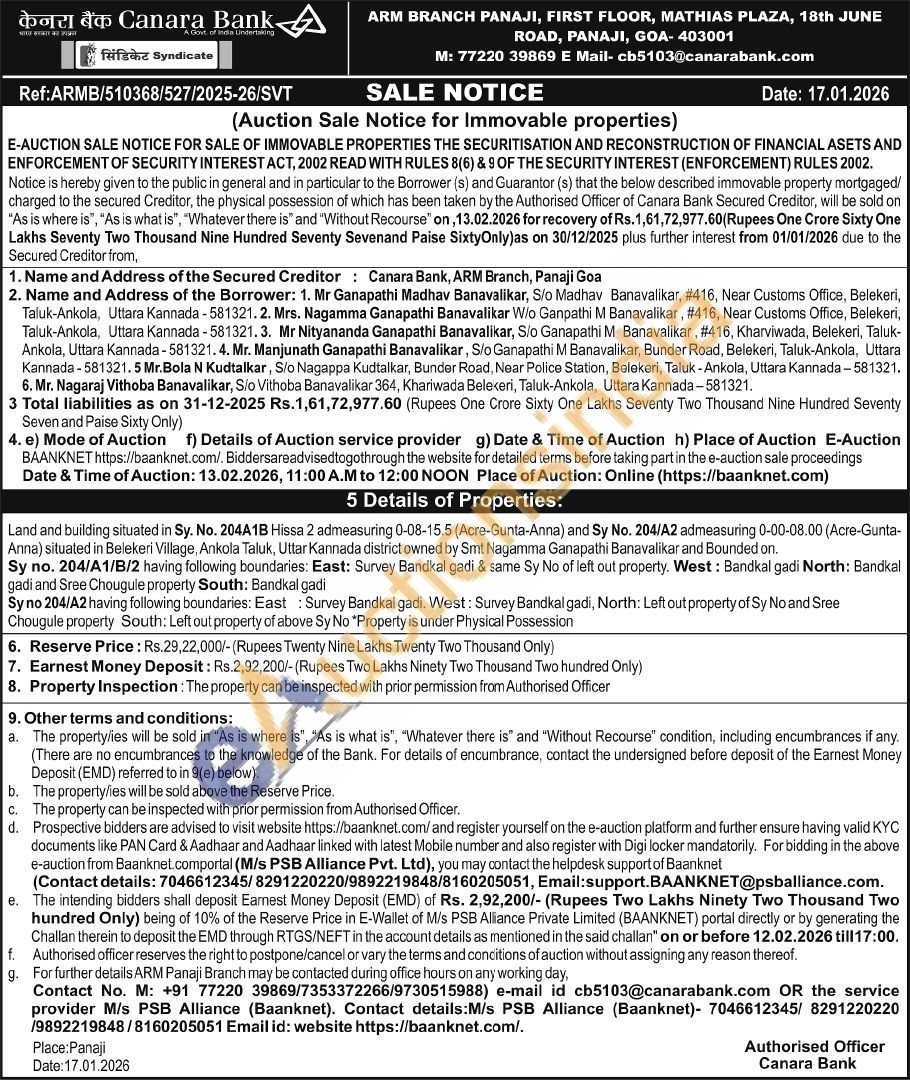 Land and building situated in Sy. No. 204A1B Hissa 2 admeasuring 0-08-15.5 (Acre-Gunta-Anna) and Sy No. 204/A2 admeasuring 0-00-08.00 (Acre-Gunta-Anna) situated in Belekeri Village, Ankola Taluk, Uttar Kannada district owned by Smt Nagamma Ganapathi Banavalikar and Bounded on. Sy no. 204/A1/B/2 having following boundaries: East: Survey Bandkal gadi & same Sy No of left out property. West: Bandkal gadi North: Bandkal gadi and Sree Chougule property South: Bandkal gadi Sy no 204/A2 having following boundaries: East: Survey Bandkal gadi. West: Survey Bandkal gadi, North: Left out property of Sy No and Sree Chougule property South: Left out property of above Sy No "Property is under Physical Possession
