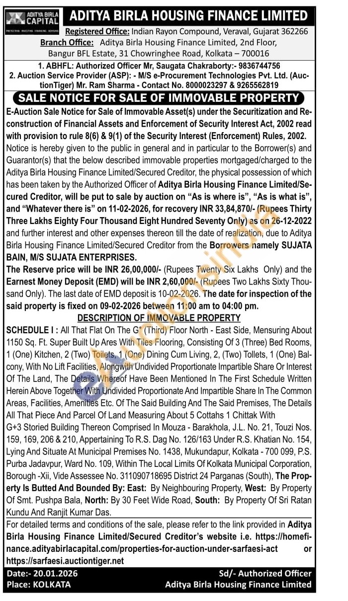 SCHEDULE I: All That Flat On The G* (Third) Floor North - East Side, Mensuring About 1150 Sq. Ft. Super Built Up Ares With Tiles Flooring, Consisting Of 3 (Three) Bed Rooms, 1 (One) Kitchen, 2 (Two) Toilets, 1 (One) Dining Cum Living, 2, (Two) Tollets, 1 (One) Bal-cony, With No Lift Facilities, Alongwith Undivided Proportionate Impartible Share Or Interest Of The Land, The Details Whereof Have Been Mentioned In The First Schedule Written Herein Above Together With Undivided Proportionate And Impartible Share In The Common Areas, Facilities, Amenities Etc. Of The Said Building And The Said Premises, The Details All That Piece And Parcel Of Land Measuring About 5 Cottahs 1 Chittak With G+3 Storied Building Thereon Comprised In Mouza - Barakhola, J.L. No. 21, Touzi Nos. 159, 169, 206 & 210, Appertaining To R.S. Dag No. 126/163 Under R.S. Khatian No. 154, Lying And Situate At Municipal Premises No. 1438, Mukundapur, Kolkata - 700 099, P.S. Purba Jadavpur, Ward No. 109, Within The Local Limits Of Kolkata Municipal Corporation, Borough -Xii, Vide Assessee No. 311090718695 District 24 Parganas (South), The Prop-erty Is Butted And Bounded By: East: By Neighbouring Property, West: By Property Of Smt. Pushpa Bala, North: By 30 Feet Wide Road, South: By Property Of Sri Ratan Kundu And Ranjit Kumar Das.