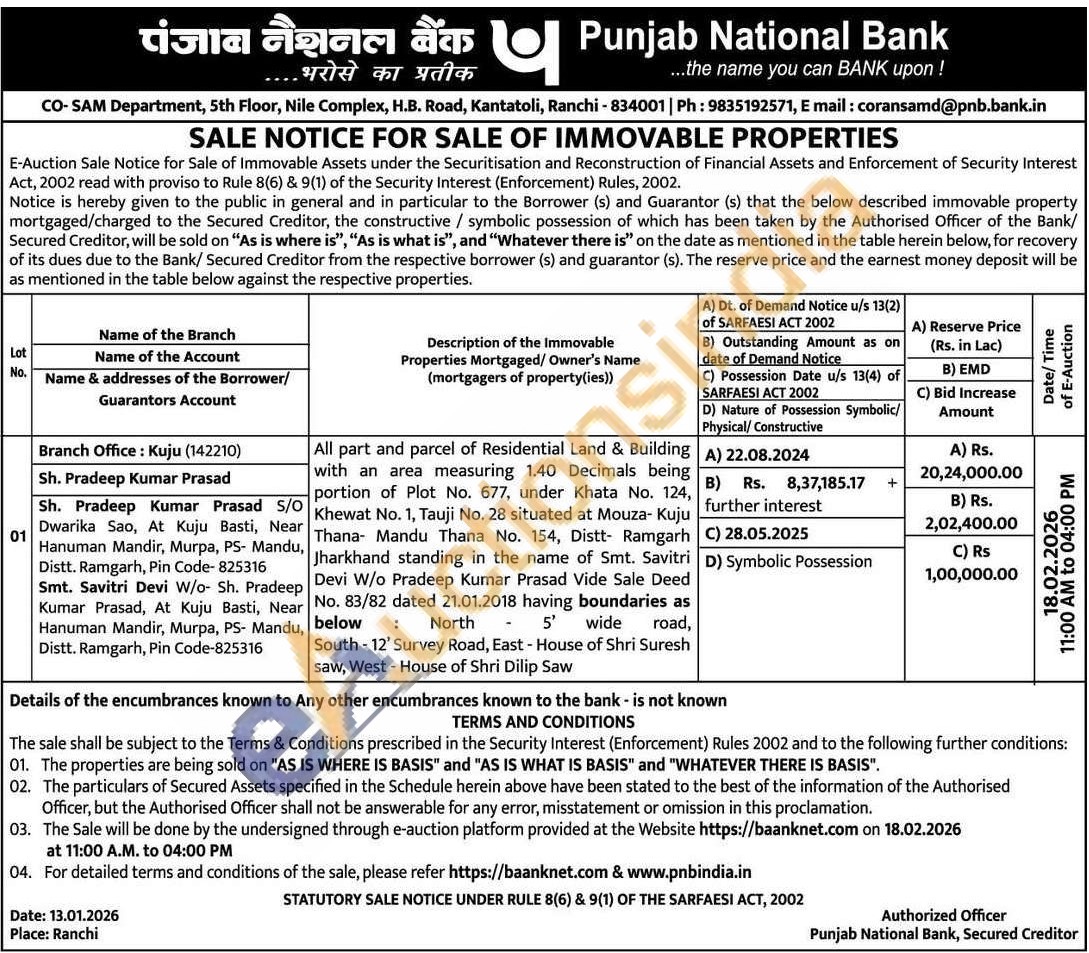 All part and parcel of Residential Land & Building with an area measuring 1.40 Decimals being portion of Plot No. 677, under Khata No. 124, Khewat No. 1, Tauji No. 28 situated at Mouza- Kuju Thana- Mandu Thana No. 154, Distt- Ramgarh Jharkhand standing in the name of Smt. Savitri Devi W/o Pradeep Kumar Prasad Vide Sale Deed No. 83/82 dated 21.01.2018 having boundaries as : North 5' wide road, below South -12' Survey Road, East - House of Shri Suresh saw, West - House of Shri Dilip Saw