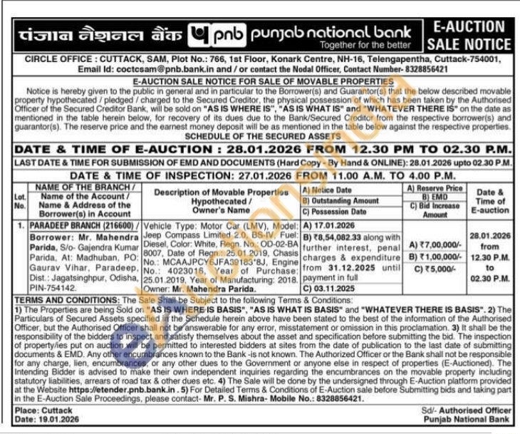 Vehicle Type: Motor Car (LMV), Model: Jeep Compass Limited 2.0. BS-IV, Fuel: Diesel, Color: White, Regn. No.: OD-02-BA 8007, Date of Regn.: 25.01.2019, Chasis No.: MCAAJPCY6JFA39183'8J, Engine No.: 4023016, Year of Purchase: 25.01.2019, Year of Manufacturing: 2018. Owner: Mr. Mahendra Parida.