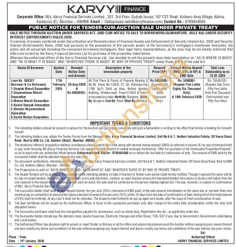 All That Piece & Parcel of Property Bearing S No.36, Hissa No.1/2A/6, PL 3A, Admeasuring 1799 Sq.Ft. Built up Area, Behind Kamble Building, Dhanka-wadi, Pune-411043 & which is bounded as under: North By: Bunglow, South By: Bunglow, East By: Road, West By: Building
