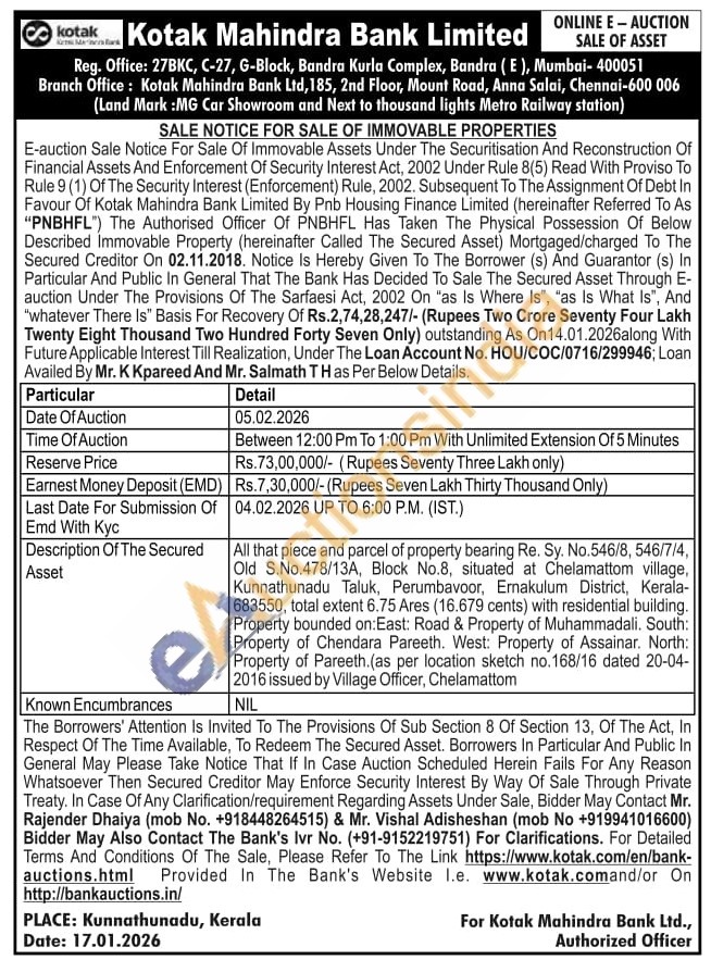 All that piece and parcel of property bearing Re. Sy. No.546/8, 546/7/4, Old S.No.478/13A, Block No.8, situated at Chelamattom village, Kunnathunadu Taluk, Perumbavoor, Ernakulum District, Kerala-683550, total extent 6.75 Ares (16.679 cents) with residential building. Property bounded on: East: Road & Property of Muhammadali. South: Property of Chendara Pareeth. West: Property of Assainar. North: Property of Pareeth. (as per location sketch no.168/16 dated 20-04-2016 issued by Village Officer, Chelamattom