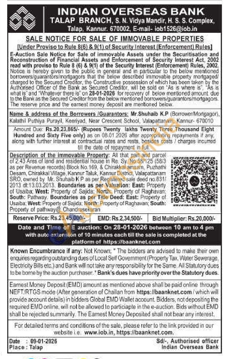 Description of the immovable Property: All that part and parcel of 2.43 Ares of land and residential house in Re. Sy. No.58/125 (58/3 as per Revenue records) Block No. 169, & Chirakkal amsam, Puzhathi Desam, Chirakkal Village, Kannur Taluk, Kannur District, Valapattanam SRO, owned by Mr. Shuhaib KP as per Registered sale deed no.831/2013 dt: 13.03.2013. Boundaries as per Valuation: East: Property of Usaiba; West: Property of Sajida; North: Property of Raghavan: South: Pathway. Boundaries as per Title Deed: East: Property of Usaiba: West: Property of Sajida: North: Property of Raghavan, South: Property of pathway@ Chandrasekaran