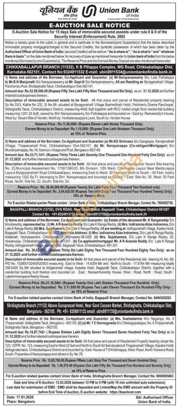Description of immovable secured assets to be Sold: All that piece and parcel of Residential Property bearing Janjar No. 123, VDPR. No. 123, measuring East to West 22 feet and North to South 62 feet situated at Thippenahalli Village, Kasaba Hobli, Sidlaghatta taluk, Chikkaballapura District and bounded by: East: House of TS Krishnappa, West: Road, North: Kaiwara Road, South: Properties of Narayanappa and others in Sy. No.76.