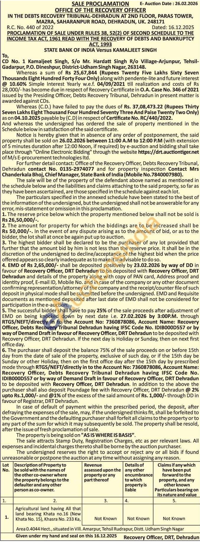 Agricultural land having All that land bearing Khata no.16 (New Khata No. 15), Khasra No. 233 Ka,Area 0.4044 Hect, situated in Vill. Amarpur, Tehsil Rudrapur, Distt. Udham Singh Nagar