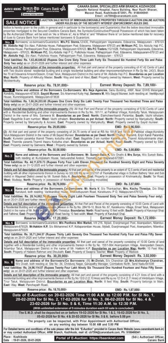 1) All that part and parcel of the property consisting of 47.42 Cents of Land with Two double stored residential buiding and a single residential building and other improvements thereon in Re Sy No. 243/3, Block No 70 at Edavanna Amsom/Desom, Emad Taluk, Malappuram District in the name of Mr. Abdulla Haj PC. Boundaries as per Location Map: North: Property of Alikkutty Master, South: Way and land of Alavi, East: Property owned by Hakeem, West: Property owned by Moideenkutty