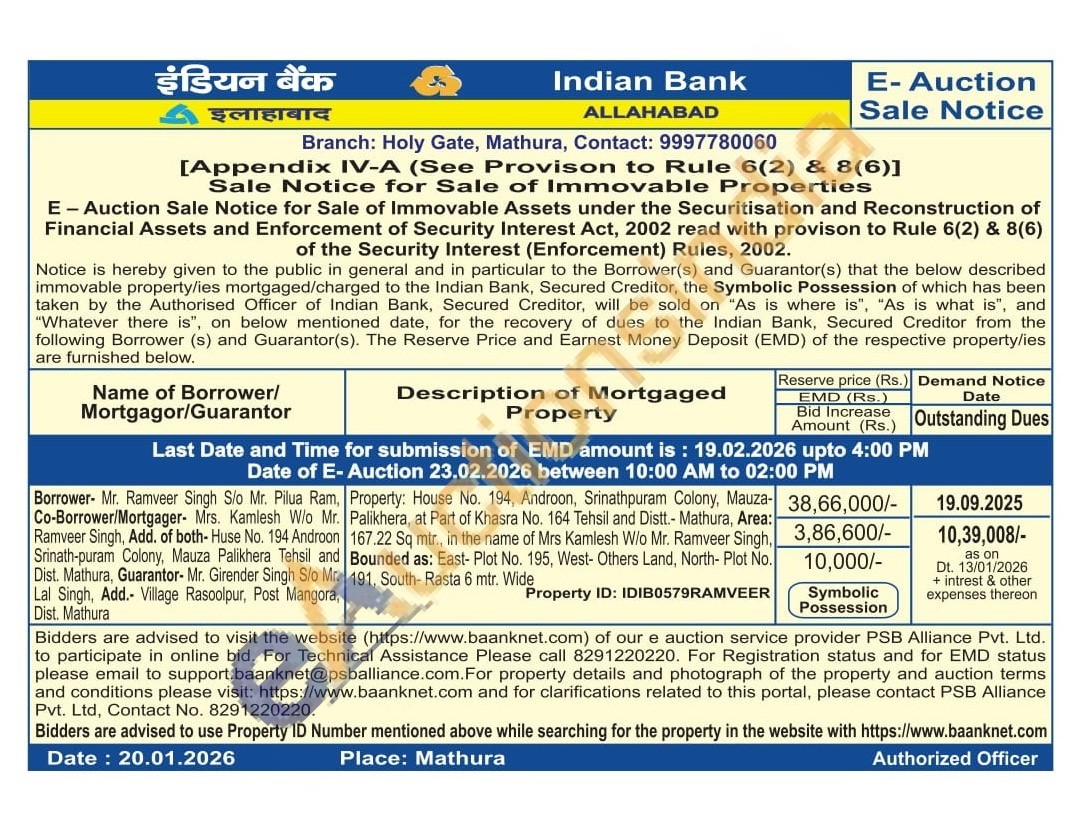 Property: House No. 194, Androon, Srinathpuram Colony, Mauza-Palikhera, at Part of Khasra No. 164 Tehsil and Distt.- Mathura, Area: 167.22 Sq mtr., in the name of Mrs Kamlesh W/o Mr. Ramveer Singh, Bounded as: East- Plot No. 195, West- Others Land, North- Plot No. 191, South- Rasta 6 mtr. Wide