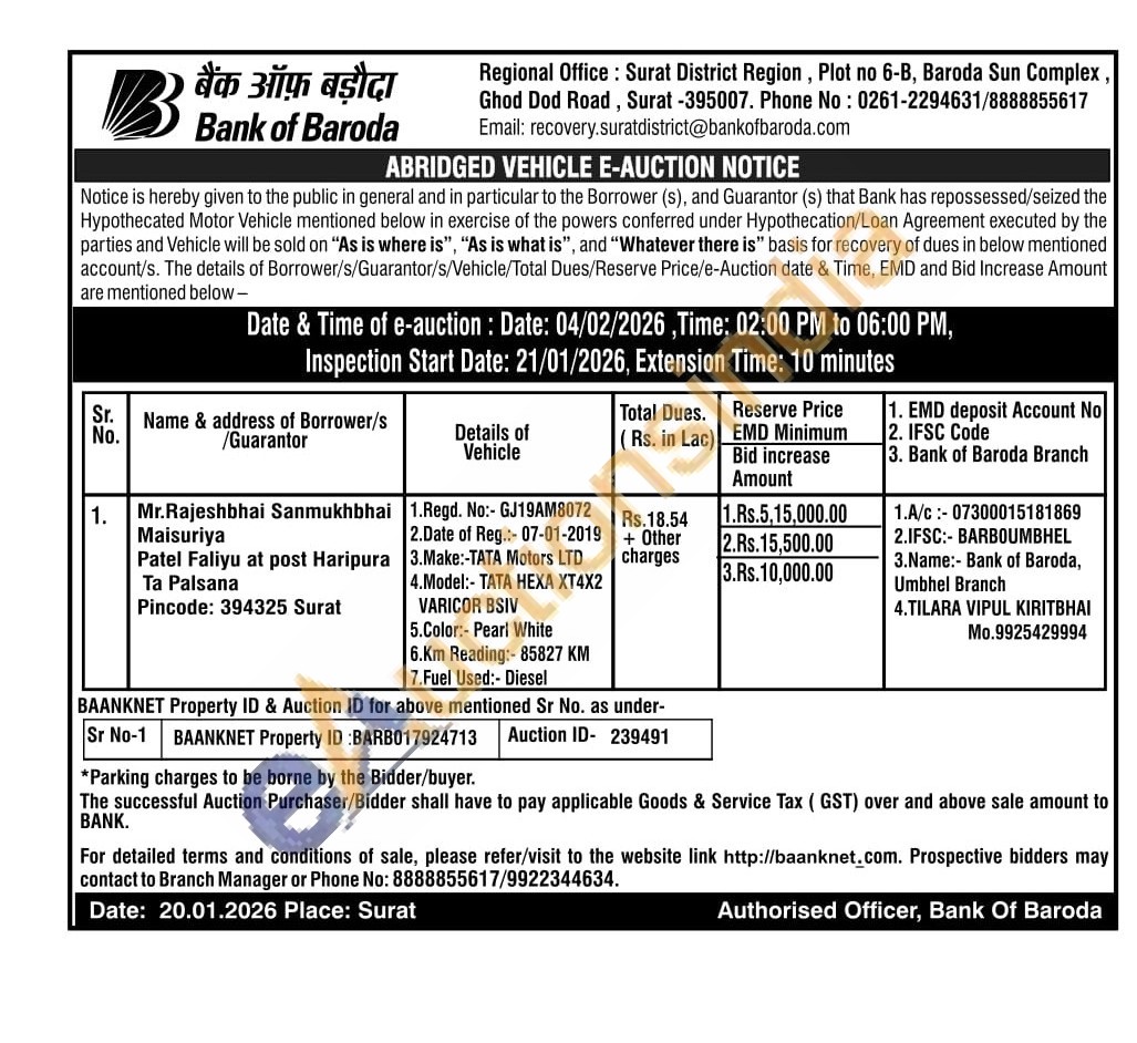 1.Regd. No:- GJ19AM8072 2.Date of Reg.: 07-01-2019 3. Make:-TATA Motors LTD 4.Model:- TATA HEXA XT4X2 VARICOR BSIV Umbhel Branch Pincode: 394325 Surat 5.Color: Pearl White 6.Km Reading:- 85827 KM 7.Fuel Used:- Diesel