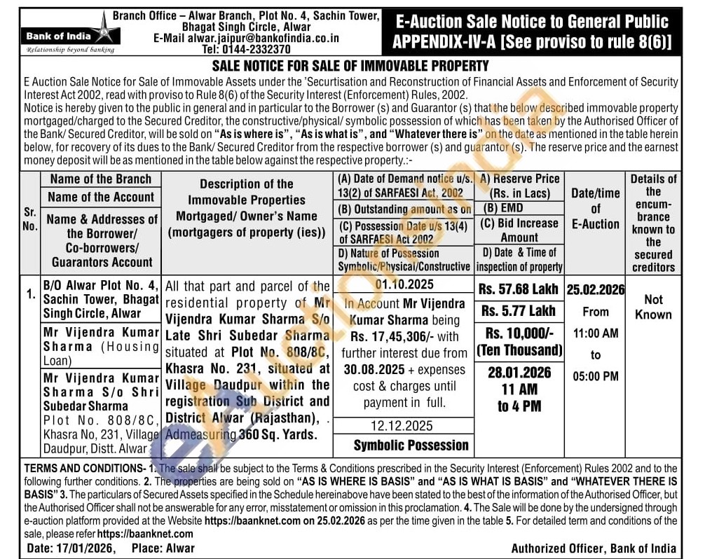 All that part and parcel of the residential property of Mr Vijendra Kumar Sharma S/o Mr Vijendra Kumar Late Shri Subedar Sharma Sharma (Housing situated at Plot No. 808/8C, Khasra No. 231, situated at Village Daudpur within the registration Sub District and District Alwar (Rajasthan), Admeasuring 360 Sq. Yards