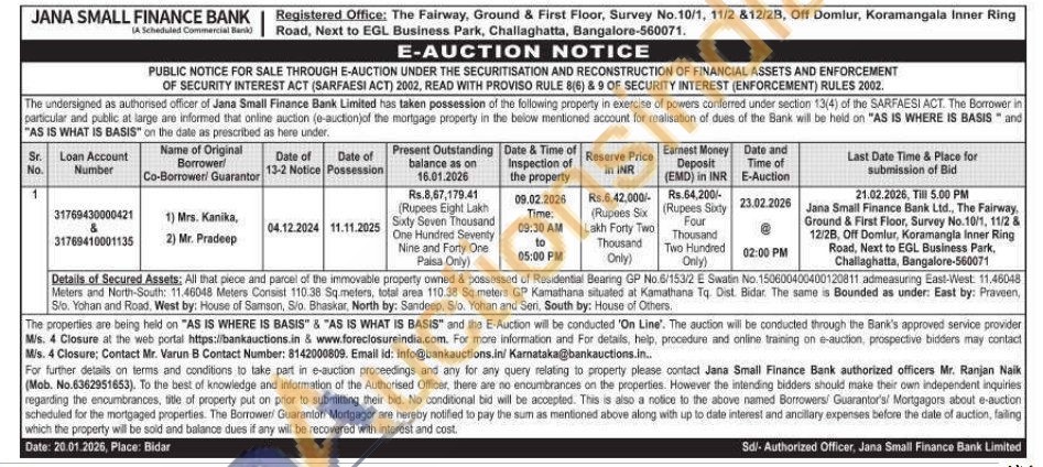 Details of Secured Assets; All that piece and parcel of the immovable property owned & possessed of Residential Bearing GP No.6/153/2 E Swatin No. 150600400400120811 admeasuring East-West: 11.46048 Meters and North-South: 11.46048 Meters Consist 110.38 Sq meters, total area 110.38 Sq.meters GP Kamathana situated at Kamathana Tq. Dist. Bidar. The same is Bounded as under: East by: Praveen, Slo. Yohan and Road, West by: House of Samson, Sio. Bhaskar, North by: Sandeep, S/o. Yohan and Seri. South by: House of Others