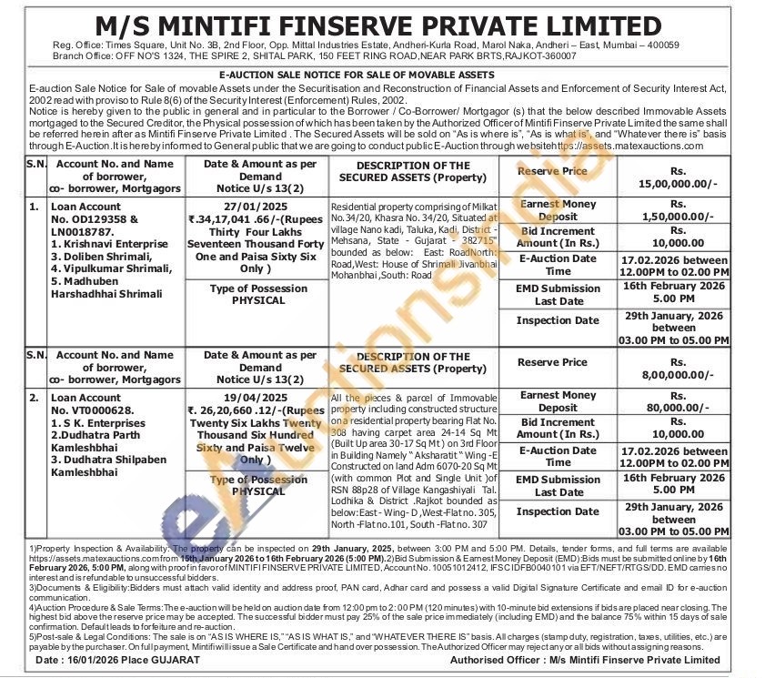 All the pieces & parcel of Immovable property including constructed structure ona residential property bearing Flat No. 308 having carpet area 24-14 Sq Mt (Built Up area 30-17 Sq Mt) on 3rd Floor in Building Namely "Aksharatit"Wing-E Constructed on land Adm 6070-20 Sq Mt (with common Plot and Single Unit )of RSN 88p28 of Village Kangashiyali Tal. Lodhika & District Rajkot bounded as below: East-Wing-D, West-Flatno, 305, North -Flatno.101, South-Flatno, 307