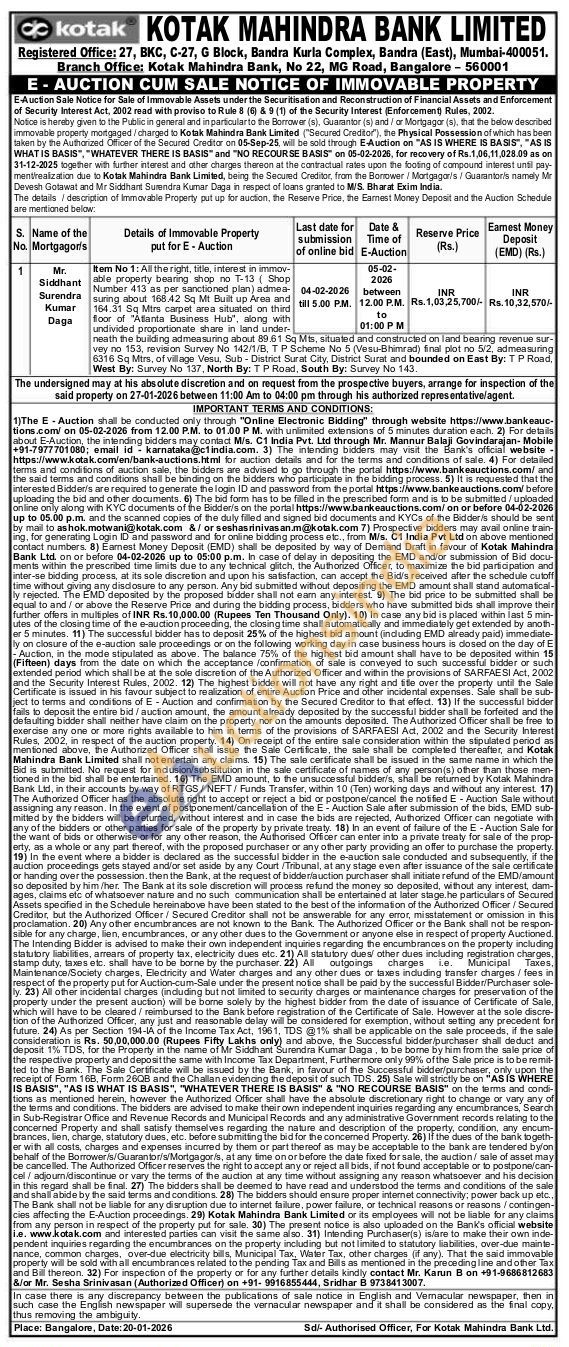 Item No 1: All the right, title, interest in immov-able property bearing shop no T-13 (Shop Number 413 as per sanctioned plan) admea-suring about 168.42 Sq Mt Built up Area and 164.31 Sq Mtrs carpet area situated on third floor of "Atlanta Business Hub", along with undivided proportionate share in land under-neath the building admeasuring about 89.61 Sq Mts, situated and constructed on land bearing revenue sur-vey no 153, revision Survey No 142/1/B, TP Scheme No 5 (Vesu-Bhimrad) final plot no 5/2, admeasuring 6316 Sq Mtrs, of village Vesu, Sub-District Surat City, District Surat and bounded on East By: T P Road, West By: Survey No 137, North By: TP Road, South By: Survey No 143