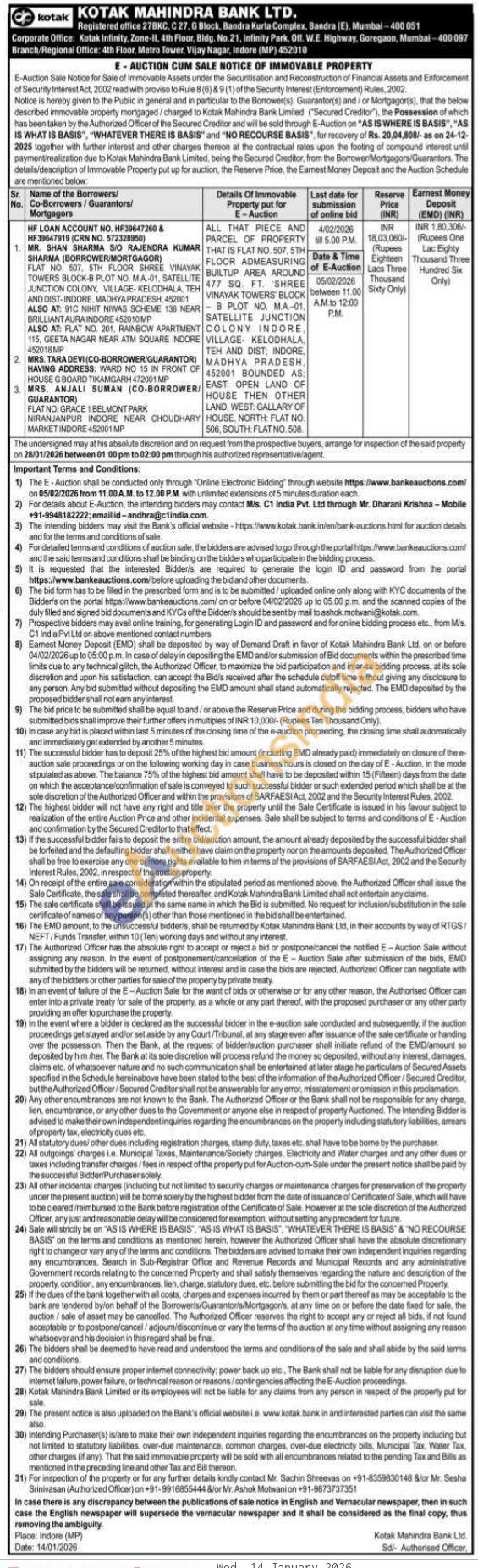 ALL THAT PIECE AND PARCEL OF PROPERTY THAT IS FLAT NO. 507, 5TH FLOOR ADMEASURING BUILTUP AREA AROUND 477 SQ. FT. SHREE VINAYAK TOWERS BLOCK B PLOT NO. M.A-01. SATELLITE JUNCTION COLONY INDORE. VILLAGE KELODHALA, TEH AND DIST, INDORE, MADHYA PRADESH, 452001 BOUNDED AS EAST: OPEN LAND OF HOUSE THEN OTHER LAND, WEST. GALLARY OF HOUSE, NORTH: FLAT NO 506, SOUTH: FLAT NO. 508