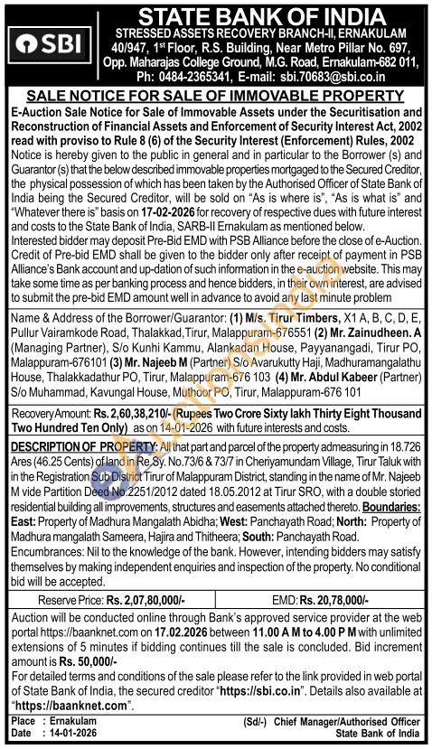 DESCRIPTION OF PROPERTY: All that part and parcel of the property admeasuring in 18.726 Ares (46.25 Cents) of land in Re.Sy. No.73/6 & 73/7 in Cheriyamundam Village, Tirur Taluk with in the Registration Sub District Tirur of Malappuram District, standing in the name of Mr. Najeeb M vide Partition Deed No.2251/2012 dated 18.05.2012 at Tirur SRO, with a double storied residential building all improvements, structures and easements attached thereto. Boundaries: East: Property of Madhura Mangalath Abidha; West: Panchayath Road; North: Property of Madhura mangalath Sameera, Hajira and Thitheera; South: Panchayath Road.