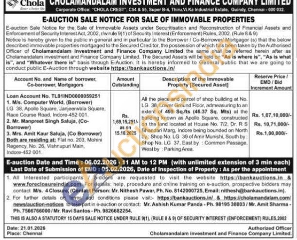 All the piece and parcel of shop building at No. LG 38, Lower Ground Floor, admeasuring to an extent of 499 Sq.fts (46.37 Sq. Mts) at the building known as Apollo Square, constructed on the land located at House No. 7/2, Dr. R S Bhandari Marg, Indore being bounded on North by: Shop No. LG 39 of Amir Munishi, South by: Shop No. LG 37, East by: Common Passage, West by Parking Area.