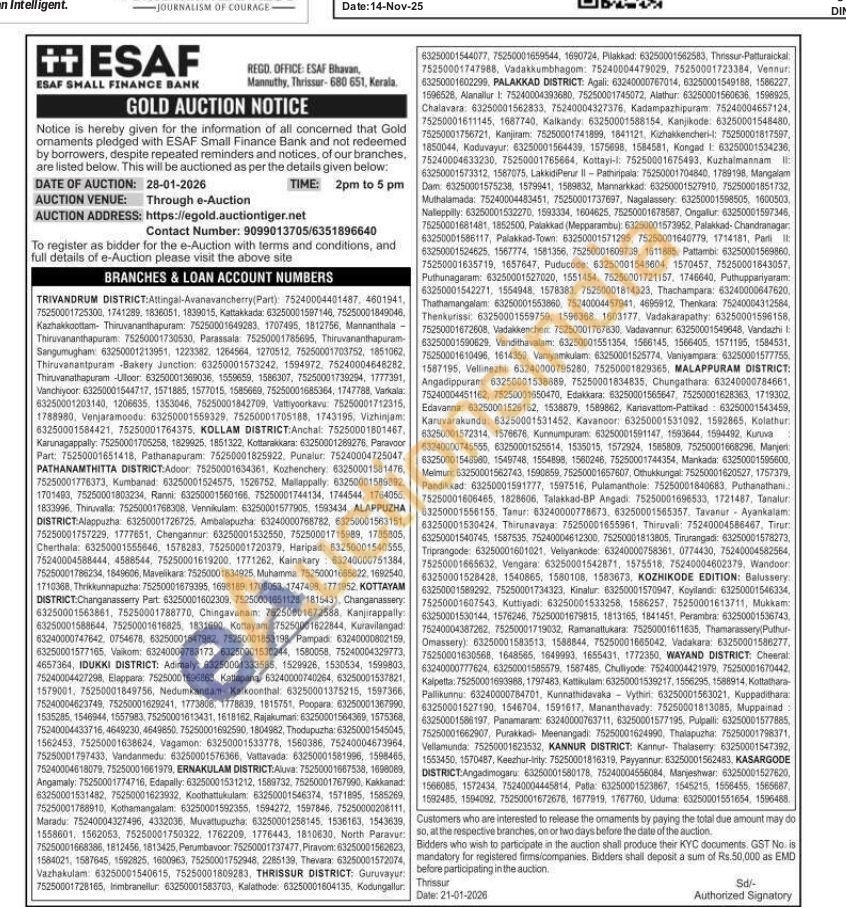 ESAF SMALL FINANCE BANK Gold Auctions Auction in Thrissur
