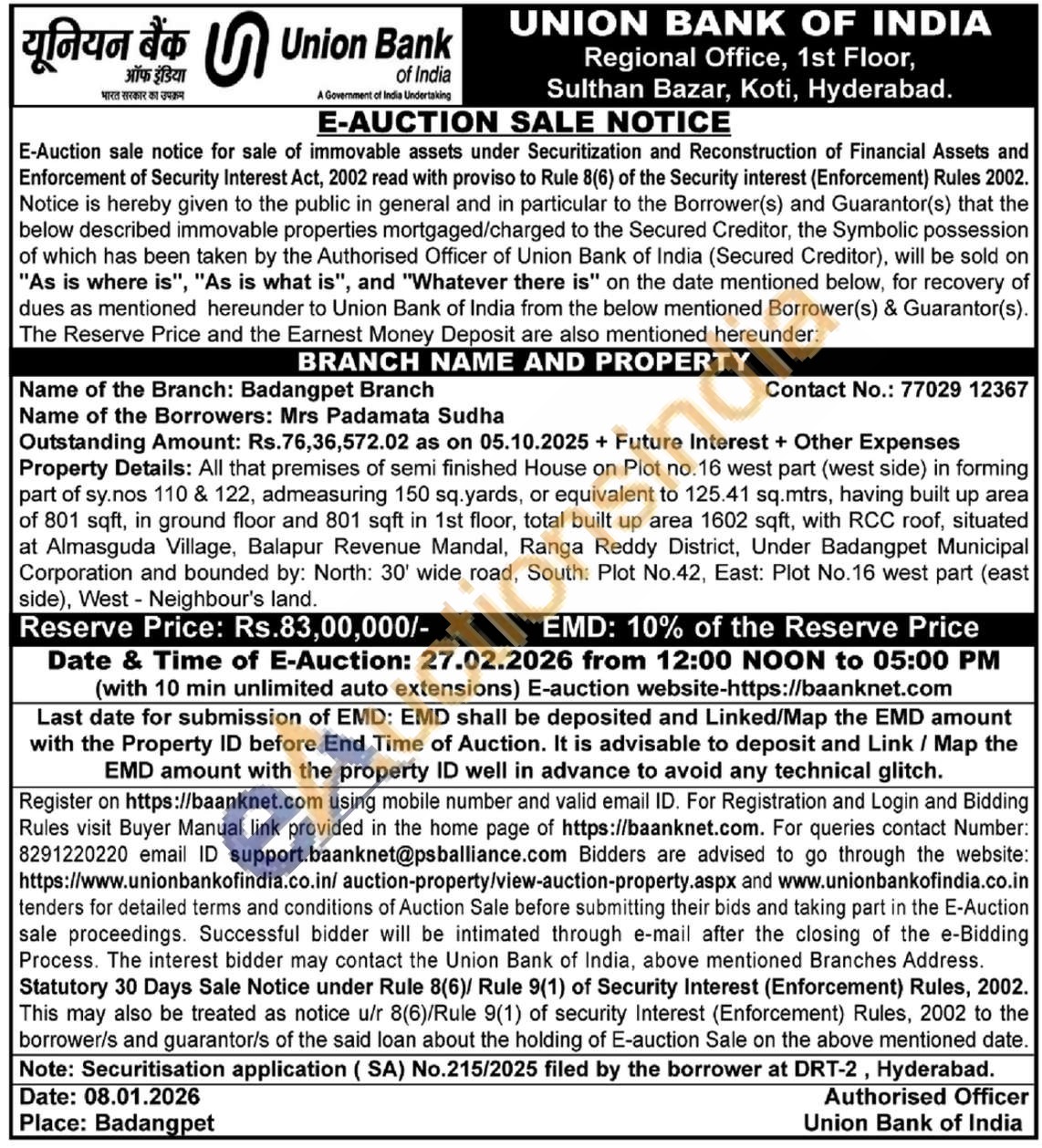 Property Details: All that premises of semi finished House on Plot no.16 west part (west side) in forming part of sy.nos 110 & 122, admeasuring 150 sq.yards, or equivalent to 125.41 sq.mtrs, having built up area of 801 sqft, in ground floor and 801 sqft in 1st floor, total built up area 1602 sqft, with RCC roof, situated at Almasguda Village, Balapur Revenue Mandal, Ranga Reddy District, Under Badangpet Municipal Corporation and bounded by: North: 30' wide road, South: Plot No.42, East: Plot No.16 west part (east side), West - Neighbour's land