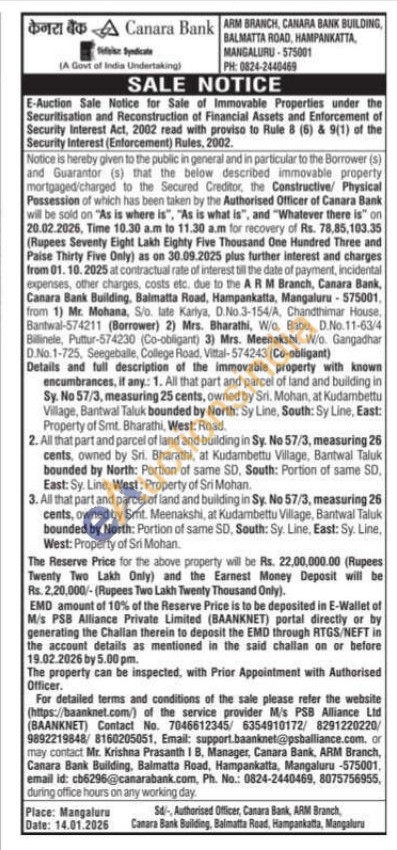 All that part and parcel of land and building in Sy. No 57/3, measuring 25 cents, owned by Sri. Mohan, at Kudambettu Village, Bantwal Taluk bounded by North: Sy Line, South: Sy Line, East: Property of Smt. Bharathi, West: Road. 2. All that part and parcel of land and building in Sy. No 57/3, measuring 26 cents, owned by Sri. Bharathi, at Kudambettu Village, Bantwal Taluk bounded by North: Portion of same SD, South: Portion of same SD. East: Sy. Line, West: Property of Sri Mohan. 3. All that part and parcel of land and building in Sy. No 57/3, measuring 26 cents, owned by Smt. Meenakshi, at Kudambettu Village, Bantwal Taluk bounded by North: Portion of same SD, South: Sy. Line, East: Sy. Line, West: Property of Sri Mohan